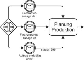 Das folgende Modellfragment beschreibt die Situation, dass zahlreiche Angebote von potentiellen Lieferanten angefordert werden. Die Geschäftsregel sei dann die, dass die Auswertung der Angebote beginnt, wenn drei eingetroffen sind. |
