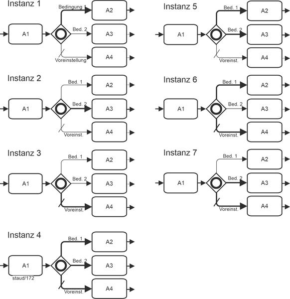 Jeder abgehende Sequenzfluss unterliegt einer booleschen Bedingung, nach der der Sequenzfluss aktiv wird (ein Token erhält) oder nicht. Diese Bedingung kann den Zustand des Gateway nutzen. Diejenigen abgehenden Sequenzflüsse, deren Bedingungen erfüllt sind, erhalten einen Token. Falls keines wahr wird, wird der voreingestgellte Sequenzfluss genutzt. Falls ein solcher nicht vorliegt, wird ein Ausnahmeereignis ausgelöst. |