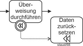 Das dritte Element im normalen Fluss zeigt an, dass Kompensation notwendig ist. Es gibt also ein Kompensations-Ereignis ab. Der Ablauf ist dann wie folgt: Wenn eine Aktivität identifiziert und erfolgreich abgeschlossen ist, wird sie zurückgenommen. Natürlich muss die Aktvivität für das Kompensations-Zwischenereignis "sichtbar" sein (vgl. unten), d.h., sie muss das Ereignis wahrnehmen können. |