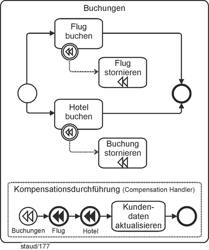 Abbildung 13.8-3: Flug- und Hotelbuchung mit Kompensations-Subprozess. Quelle: [OMG 2011, S. 303, Figure 10.122], Übersetzung durch den Verfasser. |