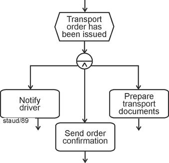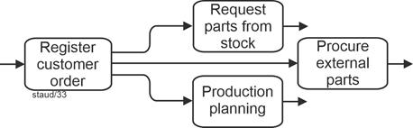 Tasks defined in this way can themselves be grouped - across multiple levels - up to the point where the entire corporate purpose is represented by a single task (e.g., "generate profit"). This is called aggregation, and it clarifies what plays an important role in the concrete modeling of business processes: |