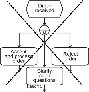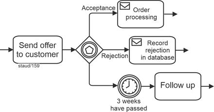 | Exclusive gateway, event-based (branching) Allows decision situations to be captured by events (message arrival). A sequence flow becomes active/must arrive. |