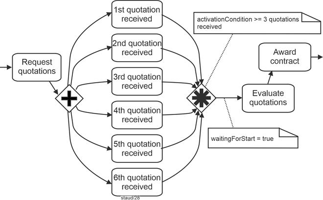 The following model fragment describes the situation in which numerous offers are requested from potential suppliers. The business rule is that the evaluation of the offers begins when three have been received. |