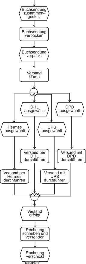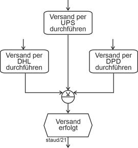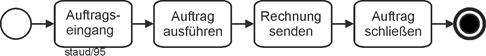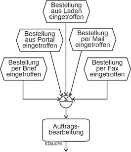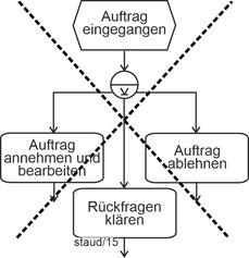 - Funktion - Funktion - Funktion - ... Es ist in vielen Unternehmen üblich, bei einer einfachen (nichtverzweigten) Abfolge von Ereignissen und Funktionen, die Ereignisse wegzulassen. Dies wird hier - wo ja die Wissensvermittlung zur Methode EPK im Vordergrund steht und die Ereignisgesteuerten Prozessketten (EPKs) auch nicht so groß werden wie in Unternehmensprojekten, nicht umgesetzt. Ein Beispiel wird aber angegeben, es befindet findet sich in Abschnitt 6.3.