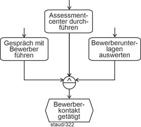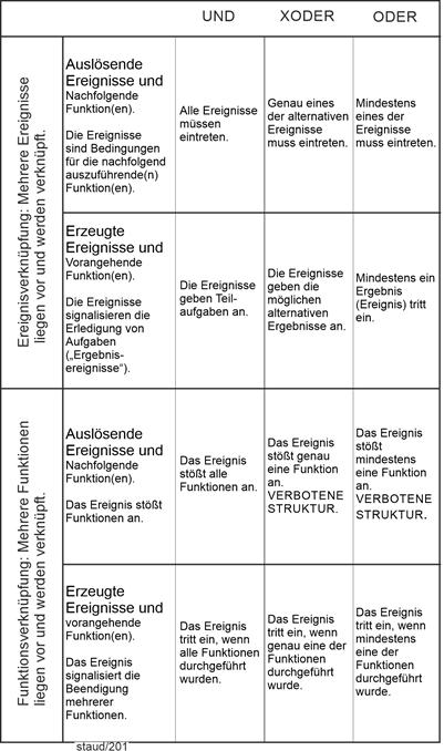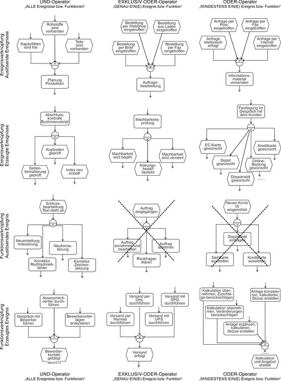 - Die Einführung in den Aufbau von Ereignisgesteuerten Prozessketten wird in Kapitel 5 fortgesetzt mit der Darstellung syntaktischer Basismuster. Vorgestellt werden alle möglichen Verknüpfungen von Ereignissen und Funktionen im Kontrollfluss. Hier steht noch die Syntax im Vordergrund, es wird aber auch bereits auf die Semantik der Fragmente hingewiesen.