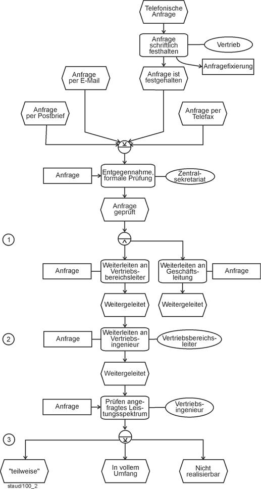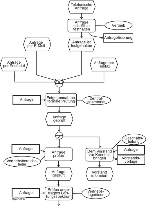 "Unter Ablauforganisation versteht man die Gestaltung von Arbeitsprozessen. ... Man unterscheidet (1) die Ordnung des Arbeitsinhalts, (2) die Ordnung der Arbeitszeit, (3) die Ordnung des Arbeitsraumes, (4) die Arbeitszuordnung" [Wöhe 1993, S. 196]. |