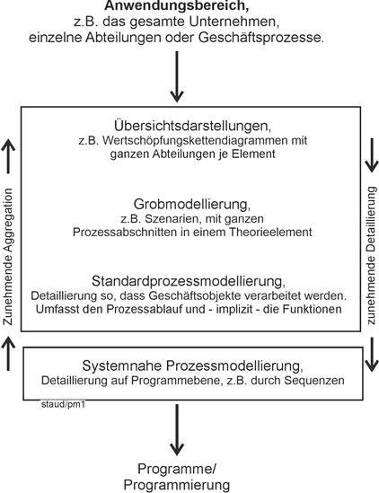 Im Bereich der Betriebswirtschaftlichen Standardsoftware oder ERP-Software ist damit ein abstraktes (nicht auf ein bestimmtes Unternehmen bezogenes) Modell der Unternehmensrealität gemeint. Dabei werden heute, in Anlehnung an die Arbeiten von Scheer, Modelle bzgl. der Datenbanken, der Organisationsstrukturen, der Funktionen (Tätigkeiten) und der Geschäftsprozesse unterschieden. Hier ist dann auch von Unternehmensmodellierung die Rede. Eine Diskussion des Begriffs auf dem allgemeinen Hintergrund der Gestaltung Integrierter Informationssysteme mit weiteren Literaturhinweisen findet sich bei [Hohmann 1999, S. 56ff]. |