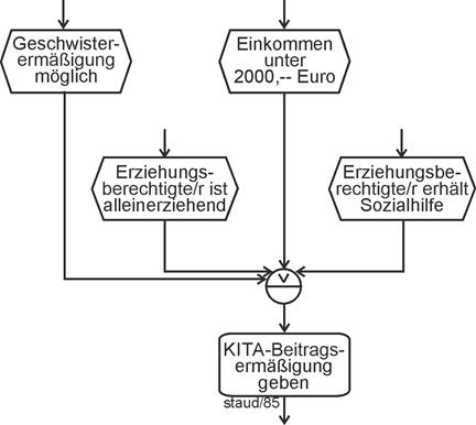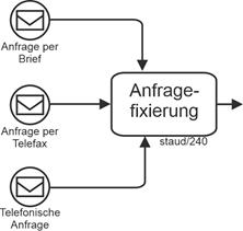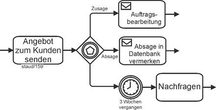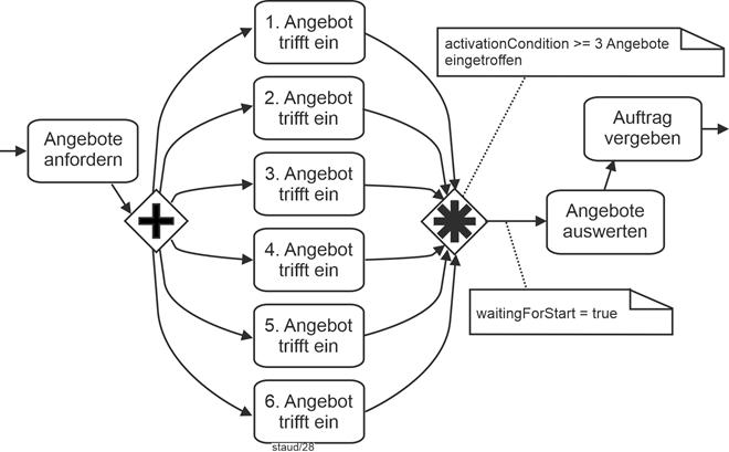 Das folgende Modellfragment beschreibt die Situation, dass zahlreiche Angebote von potentiellen Lieferanten angefordert werden. Die Geschäftsregel sei dann die, dass die Auswertung der Angebote beginnt, wenn drei eingetroffen sind. |