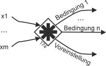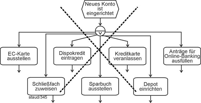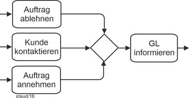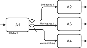 Das folgende Beispiel dient auch zur Illustration der obigen Ausführungen. Am Gateway liegen m Sequenzflüsse an, die wie beschrieben ausgewertet werden und es gehen n Sequenzflüsse sowie ein voreingestellter Sequenzfluss ab. Welche abgehen, hängt von den Auswertungen beim Gateway ab. |