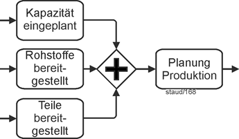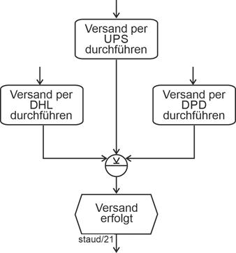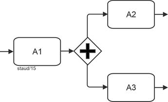| Inclusive Gateway (verzweigend und verknüpfend) Dient zur Verzweigung und Verknüpfung gemäß dem logischen ODER ("beliebige Teilmenge") |