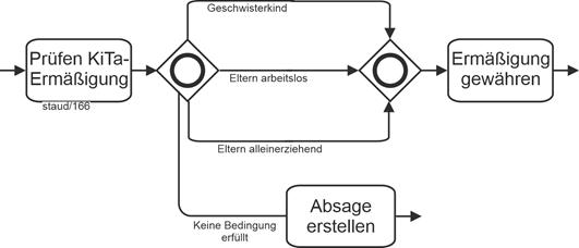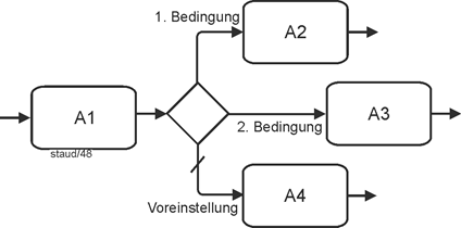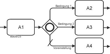 Jeder abgehende Sequenzfluss unterliegt einer booleschen Bedingung, nach der der Sequenzfluss aktiv wird (ein Token erhält) oder nicht. Diese Bedingung kann den Zustand des Gateway nutzen. Diejenigen abgehenden Sequenzflüsse, deren Bedingungen erfüllt sind, erhalten einen Token. Falls keines wahr wird, wird der voreingestgellte Sequenzfluss genutzt. Falls ein solcher nicht vorliegt, wird ein Ausnahmeereignis ausgelöst. |
