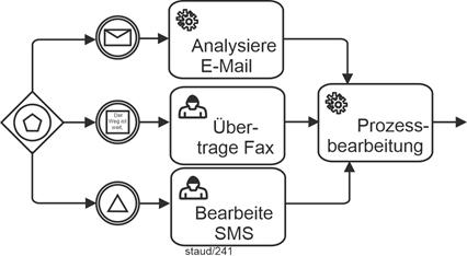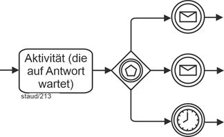 | Exclusive Gateway, ereignisbasiert (verzweigend) Erlaubt die Erfassung von Entscheidungssituationen durch Ereignisse (Nachrichteneingang). Ein Sequenzfluss wird aktiv / muss ankommen. |