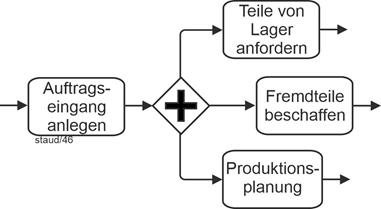 | Parallel Gateway (verzweigend und verknüpfend) Parallel bedeutet, dass die Aufgaben unabhängig voneinander gestartet und abgearbeitet werden. Alle müssen aber gestartet werden bzw. ankommen, damit "es weiter geht". |