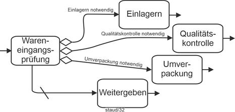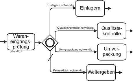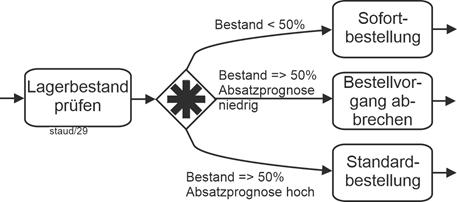 Es gibt tatsächlich Situationen in Geschäftsprozessen, die sich mit den Standardoperatoren bzw. -gateways nicht oder nur sehr schwer und unter Inkaufnahme syntaktisch komplexer Konstruktionen abbilden lassen. Dafür wird in der BPMN das Complex Gateway genommen. Im folgenden Beispiel geht es um eine, z.B. regelmäßig automatisiert stattfindende, Prüfung des Lagerbestandes. Abhängig vom Ergebnis der Prüfung (hier vereinfacht) erfolgen die weiteren Tätigkeiten. |