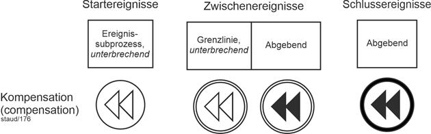 Enthaltene Elemente (Auswahl): - Kompensations-Aufgabe - Kompensations-Startereignis / Ereignissubprozess, unterbrechend - Kompensations-Ereignissubprozess(entfaltet)) - Kompensations-Zwischenereignis / abgebend - Kompensations-Zwischenereignis / Grenzlinie, unterbrechend |