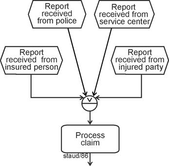 | Complex Gateway (branching and merging) Does not rely on logical operators. It is intended to make situations manageable that cannot be handled with the other gateways ("... to model complex synchronization behavior" [OMG 2011, p. 295]). |
