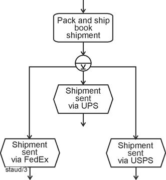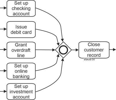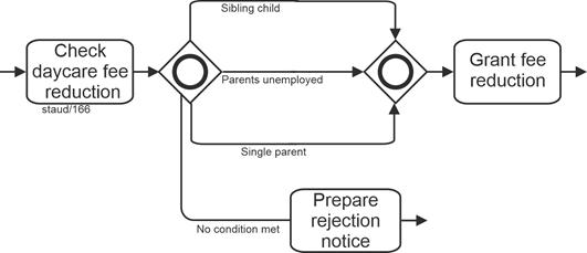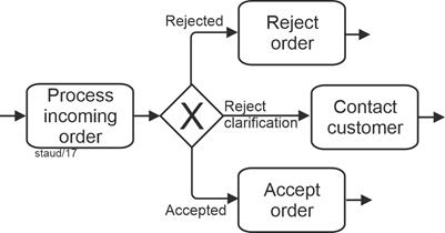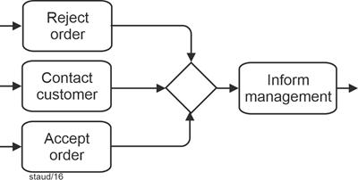 | Exclusive gateway, data-based (branching and merging) Allows decision situations to be captured "from within the process." A sequence flow becomes active/must arrive. |