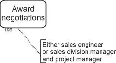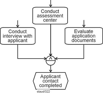 The following model fragment describes the situation in which numerous offers are requested from potential suppliers. The business rule is that the evaluation of the offers begins when three have been received. |
