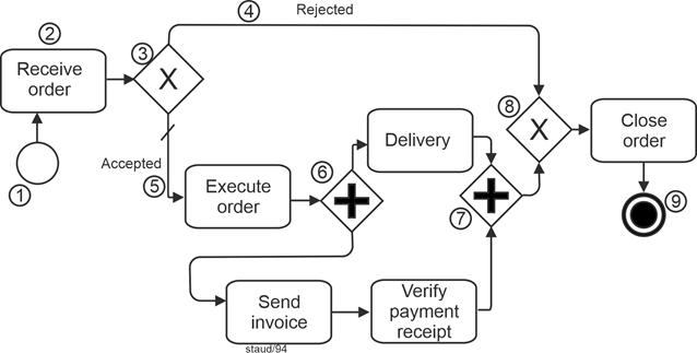 With the above description, the preparation for implementation - whether in terms of programming or execution by a business process engine - is already clarified to some extent. The concept therefore aims at the automated execution of processes, not at as-is analyses. |