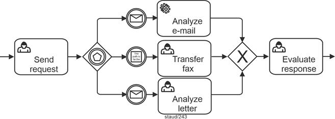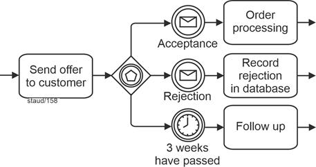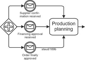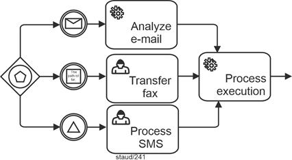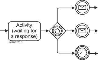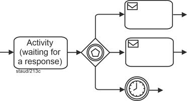 | Exclusive gateway, event-based (branching) Allows decision situations to be captured by events (message arrival). A sequence flow becomes active/must arrive. |
