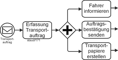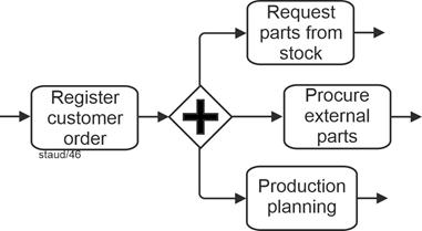 | Parallel Gateway (branching and merging) Parallel means that the tasks are started and processed independently of each other. However, all of them must be started or arrive in order for "things to continue." |