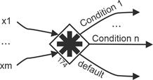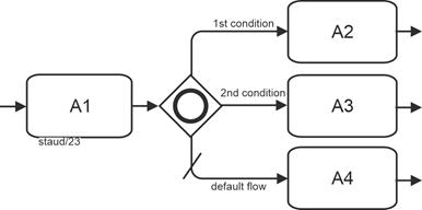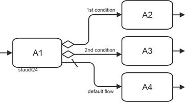 Each outgoing sequence flow is subject to a Boolean condition that determines whether the sequence flow becomes active (receives a token) or not. This condition can use the state of the gateway. Those outgoing sequence flows whose conditions are met receive a token. If none are true, the default sequence flow is used. If there is no default sequence flow, an exception event is triggered. |