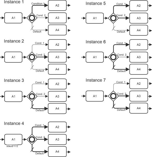 The following example also serves to illustrate the above explanations. There are m sequence flows at the gateway, which are evaluated as described, and n sequence flows and one preset sequence flow depart. Which ones depart depends on the evaluations at the gateway. |