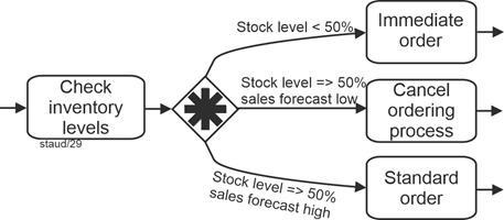 There are indeed situations in business processes that cannot be mapped using standard operators or gateways, or can only be mapped with great difficulty and by accepting syntactically complex constructions. For such cases, BPMN provides the Complex Gateway. The following example deals with a regularly automated inventory check. Depending on the result of the check (simplified here), further activities are carried out. |