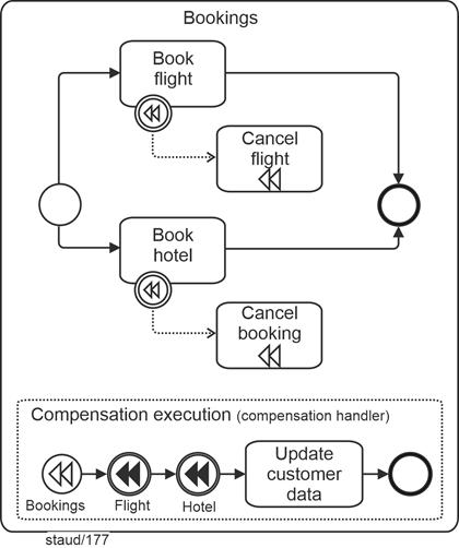 Figure 13.8-3: Flight and hotel booking, with compensation subprocess. Source: [OMG 2011, p. 303, Figure 10.122], slightly modified. |